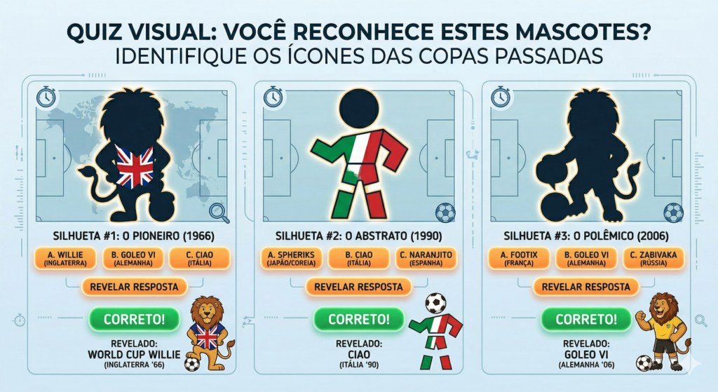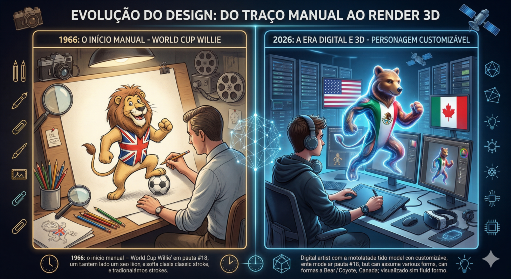 Desde que o leão World Cup Willie (ao lado) apareceu em 1966, a figura do mascote tornou-se uma ferramenta de marketing de bilhões de dólares. Em 2026, as estrelas da vez são três: Maple (alce, representando o Canadá), Zayu (onça-pintada, do México) e Clutch (águia-americana, símbolo dos EUA).