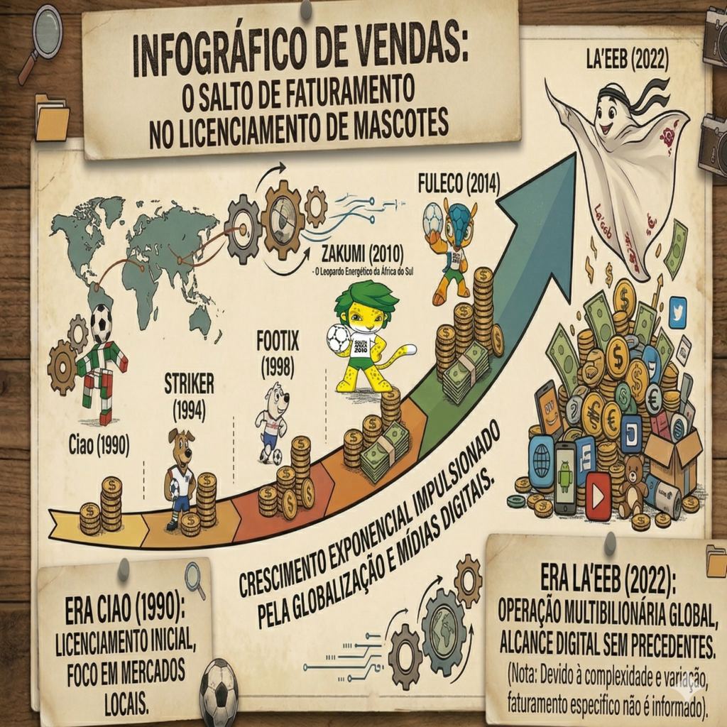 | 2022 / Catar | La’eeb | Um lenço de cabeça (Keffiyeh) | Gerou memes globais comparando-o ao “Gasparzinho”. |